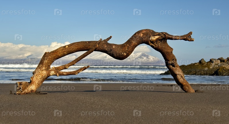 Россия. Дальний Восток, Курильские острова. Природный ландшафт с причудливой корягой на прибрежном вулканическом песке Тихого океана