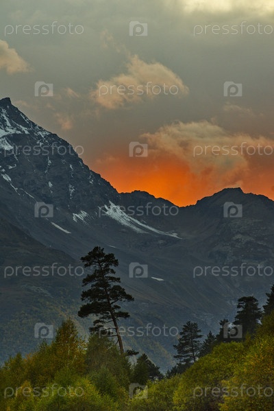 Россия. Северный Кавказ, Карачаево-Черкесия. Вид на неприступные горы, за которыми спряталось вечернее солнце освещая небо багровыми тонами