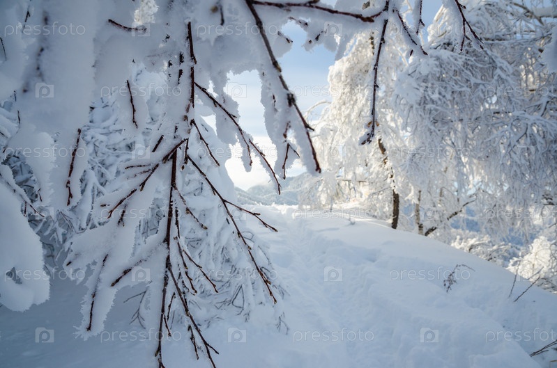 Ветка дерева в инее, снежный лес в тени и солнце в горах, белые деревья