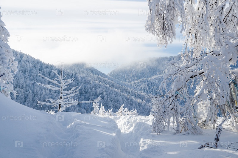 Тропа сугробах, снежный лес и горы в облаках