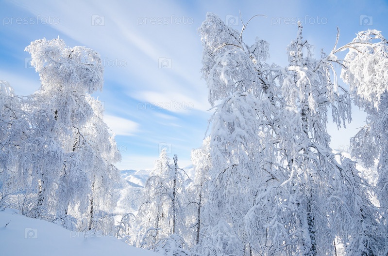 Белые деревья в инее на склоне горы, голубое небо и высокие облака