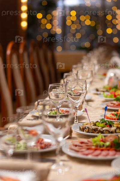 Сервированный праздничный стол с закусками, бокалами, бокалами, столовыми приборами и салфетками для банкета по случаю свадьбы или дня рождения или Рождества или другого яркого события в ресторане
