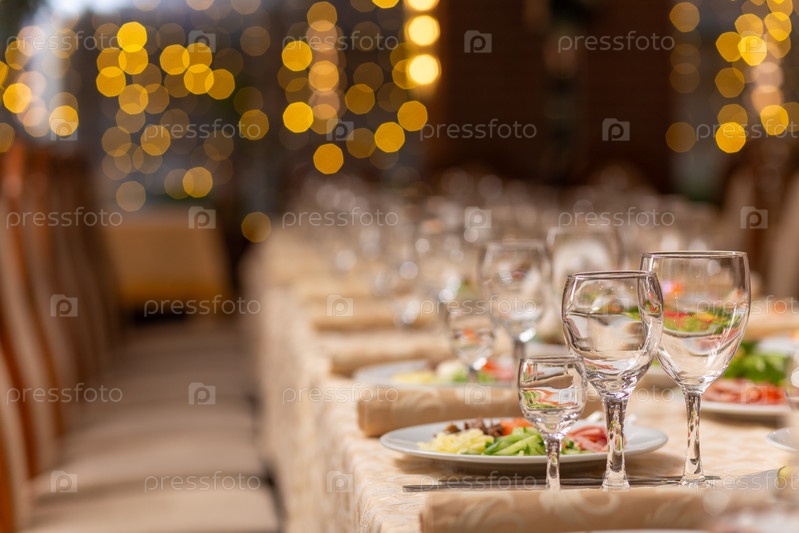 Сервированный праздничный стол с закусками, бокалами, бокалами, столовыми приборами и салфетками для банкета по случаю свадьбы или дня рождения или Рождества или другого яркого события в ресторане