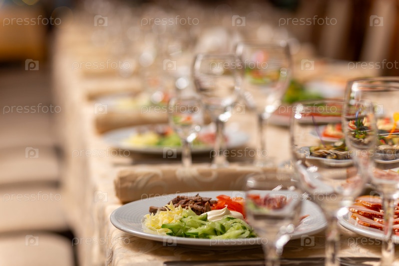 Сервированный праздничный стол с закусками, бокалами, бокалами, столовыми приборами и салфетками для банкета по случаю свадьбы или дня рождения или Рождества или другого яркого события в ресторане