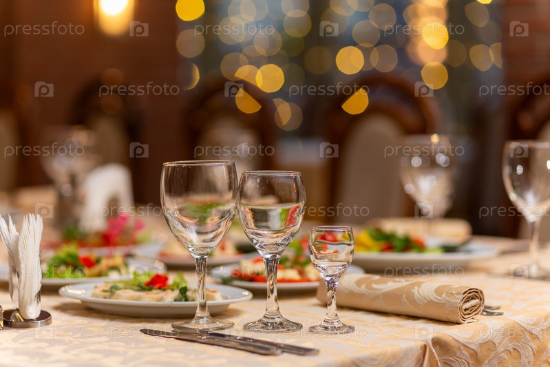Сервированный праздничный стол с закусками, бокалами, бокалами, столовыми приборами и салфетками для банкета по случаю свадьбы или дня рождения или Рождества или другого яркого события в ресторане