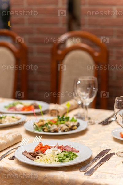 Сервированный праздничный стол с закусками, бокалами, стаканами, столовыми приборами и салфетками для банкета