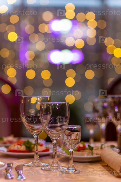 Сервированный праздничный стол с закусками, бокалами, стаканами, столовыми приборами и салфетками для банкета