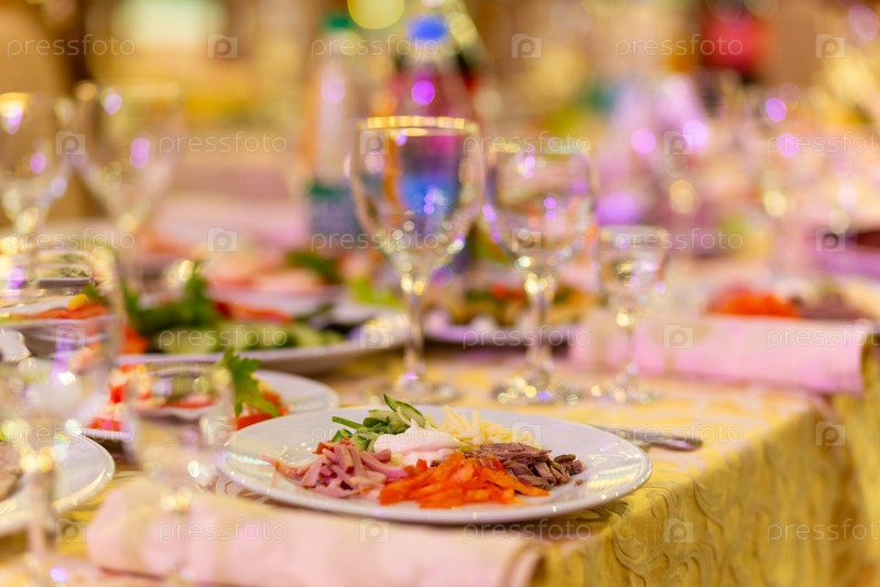 Сервированный праздничный стол с закусками, бокалами, стаканами, столовыми приборами и салфетками для банкета