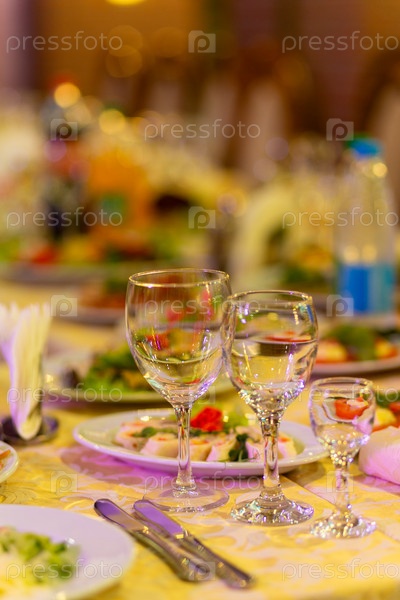 Сервированный праздничный стол с закусками, бокалами, стаканами, столовыми приборами и салфетками для банкета