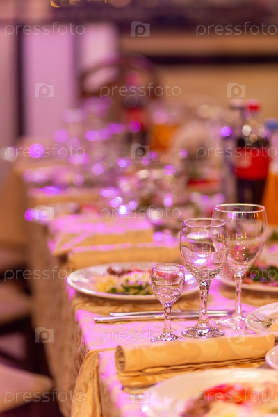 Сервированный праздничный стол с закусками, стаканами, стаканами, столовыми приборами и салфетками для банкета
