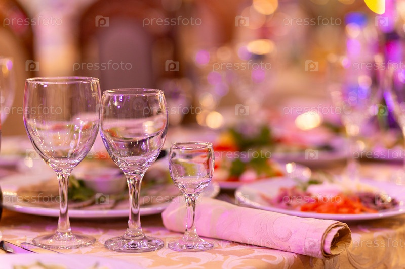 Сервированный праздничный стол с закусками, стаканами, стаканами, столовыми приборами и салфетками для банкета