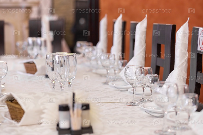 Сервированный праздничный стол с посудой, стаканами, стаканами, столовыми приборами и салфетками для банкета по случаю свадьбы или дня рождения или Рождества или другого яркого события в ресторане
