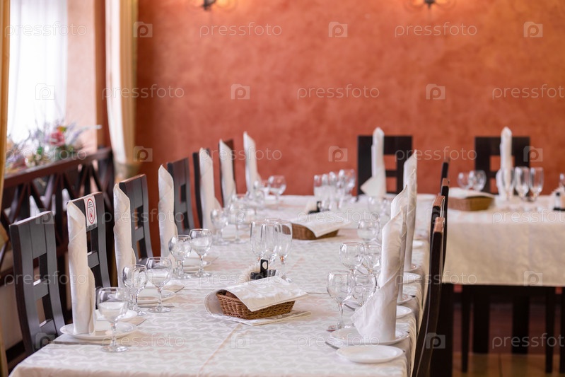 Сервированный праздничный стол с посудой, стаканами, стаканами, столовыми приборами и салфетками для банкета по случаю свадьбы или дня рождения или Рождества или другого яркого события в ресторане