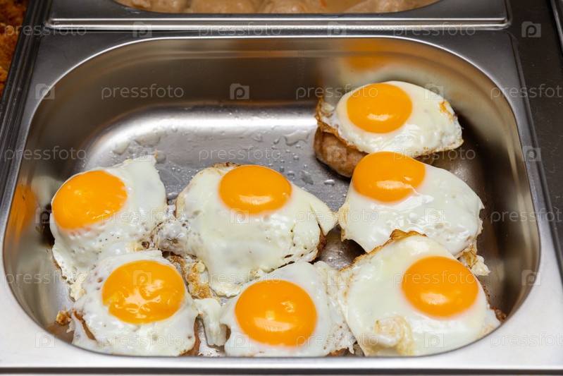 Стейки из говядины с жареным яйцом в лотке из нержавеющей стали. Яичница с говяжьей котлетой на шведском столе отеля, на прилавке кулинарии, продовольственном рынке