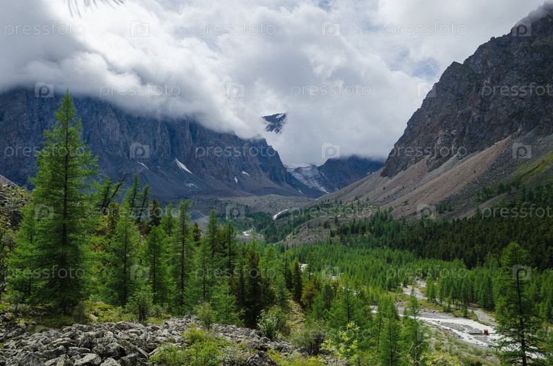 Лес на высоте, облака на горах, река внизу. Алтай, Актру