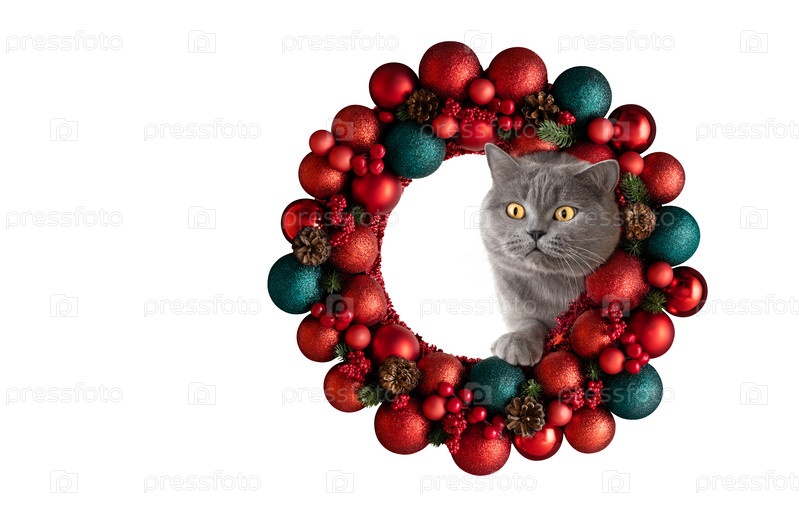 Британский кот смотрит сквозь красный рождественский венок, изолированный на белом фоне. Милый кот и новогодние украшения. Копирование пространства