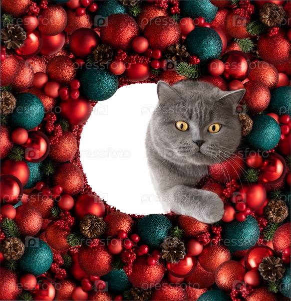 Британский кот выглядывает из круглого отверстия рождественских красных украшений. Милый кот и новогодний декор. Концепция Нового года и Рождества