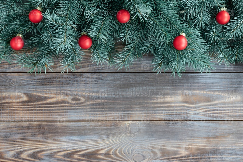 Рождественский деревянный фон с еловыми ветками и красными праздничными украшениями. Новогодняя рамка. Копирование пространства, вид сверху, плоская планировка