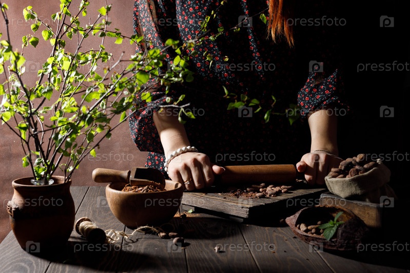 На столе стоит миска с измельченным какао, рядом доска и скалка, которой пользовались