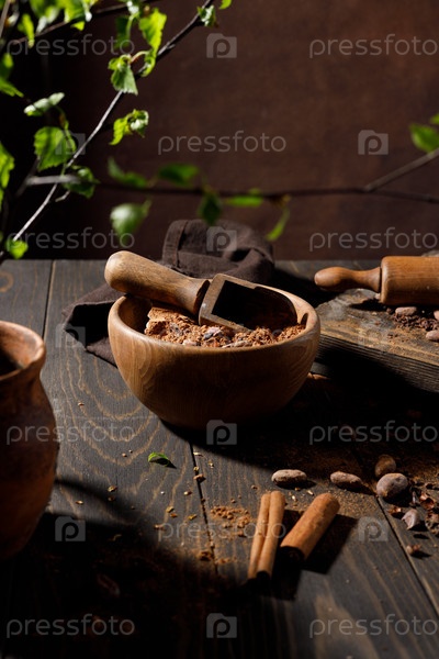 На столе стоит миска с измельченным какао, рядом доска и скалка, которой пользовались