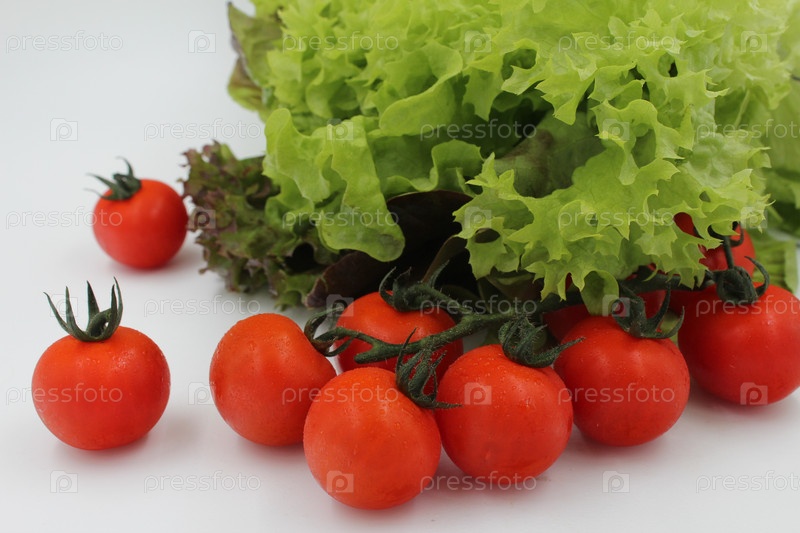 Помидоры черри на ветке и листья салата на белом фоне