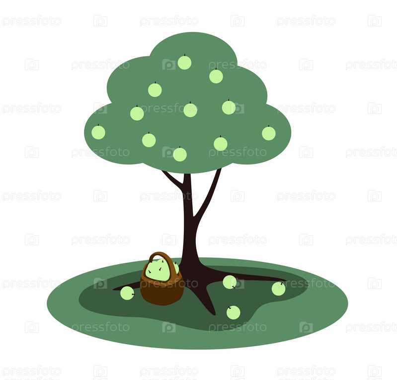 Векторная яблоня рядом с корзиной с собранными яблоками на белом фоне