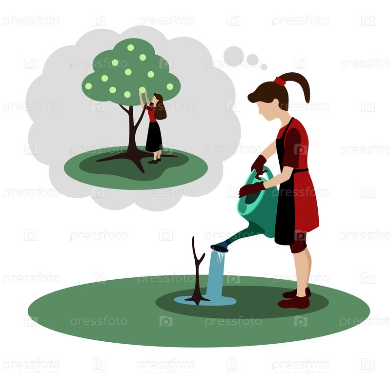 Молодая девушка в садовых перчатках поливает саженец яблони из большой лейки и думает о том, как она вырастет и будет собирать яблоки с яблони