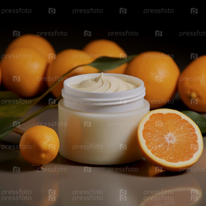 На столе стоит баночка с кремом для лица и тела, окруженная апельсинами