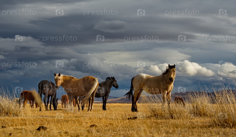 Россия, Горный Алтай. Мирно пасущийся в степи небольшой табун лошадей на фоне пасмурного темного неба на закате дня