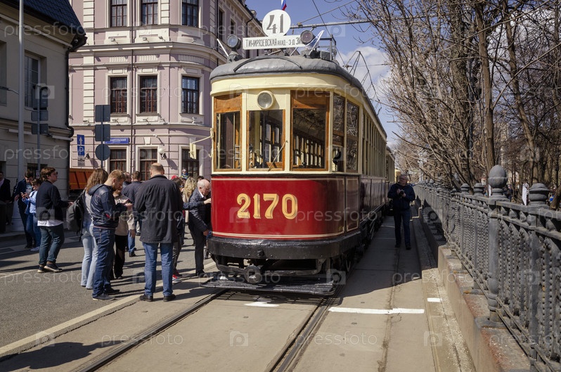 МОСКВА, РОССИЯ - 21 апреля 2018 года: Ретро-трамваи идут на парад на пустой улице старого города Москвы, Россия, 21 апреля 2018 года
