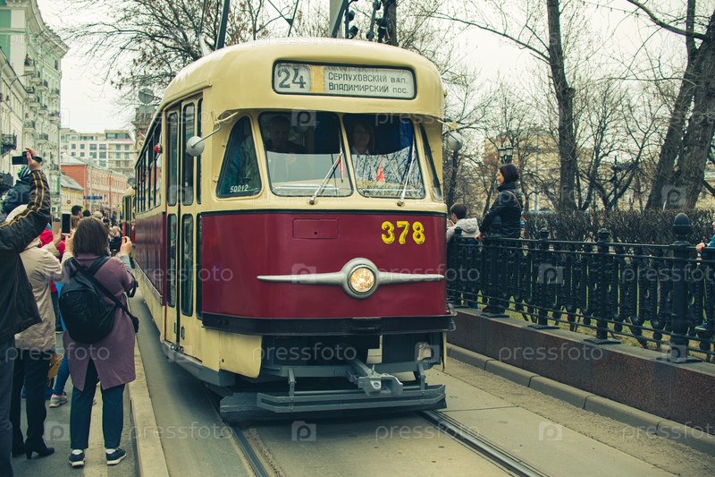 Москва / Россия - 20 апреля 2019 года: Ежегодный парад трамваев в Москве, Россия. Ретро, классические и современные трамваи движутся по маршрутам центра Москвы
