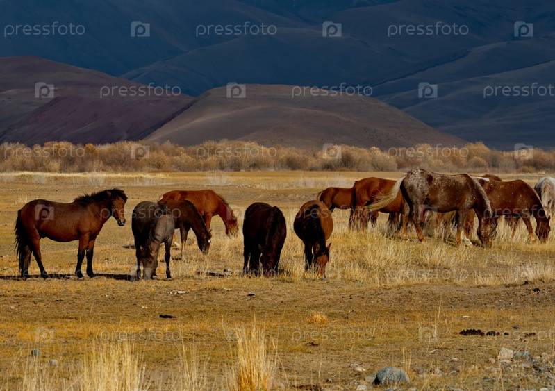 Россия, Горный Алтай. Мирно пасущийся в степи небольшой табун лошадей на фоне пасмурного темного неба на закате дня