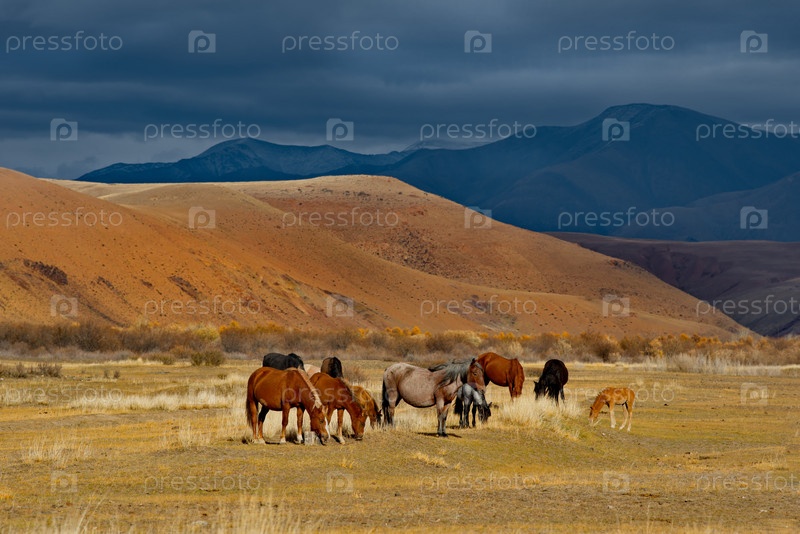 Россия, Горный Алтай. Мирно пасущийся в степи небольшой табун лошадей на фоне пасмурного темного неба на закате дня