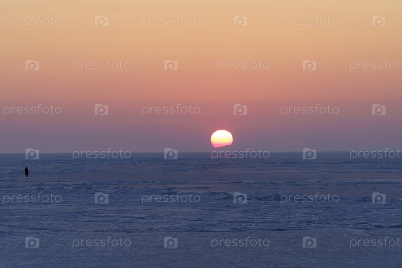 Замерзший Амурский залив на закате. Владивосток, Россия