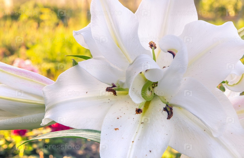 Цветущая белая лилия на ярком летнем фоне