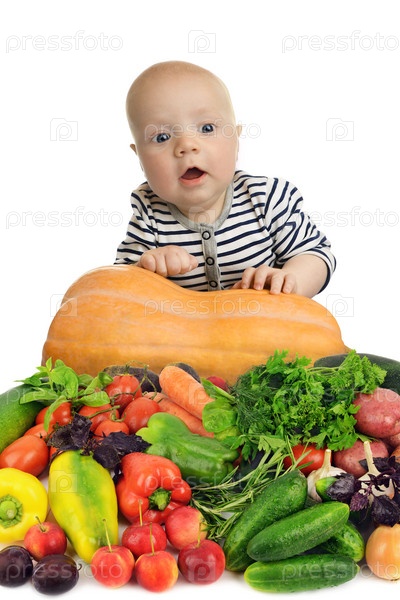 Ребенок среди свежих и натуральных овощей, изолированных на белом фоне