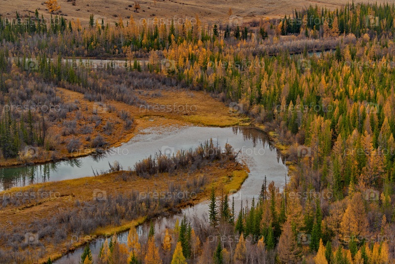 Россия, Горный Алтай. Вид с горного перевала на осеннюю реку Чуя вдоль Чуйского тракта в районе Северо-Муйского горного хребта