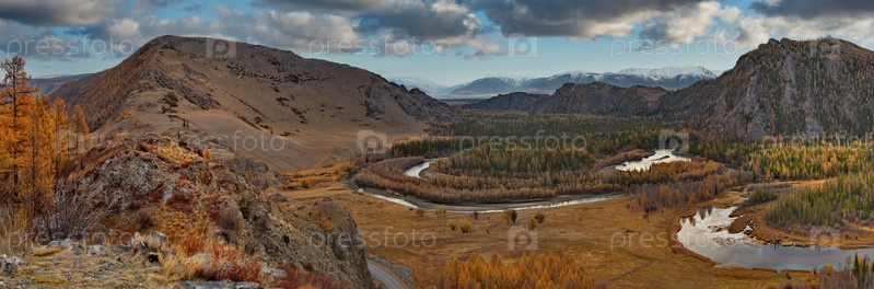 Россия, Горный Алтай. Вид с горного перевала на осеннюю реку Чуя вдоль Чуйского тракта в районе Северо-Муйского горного хребта