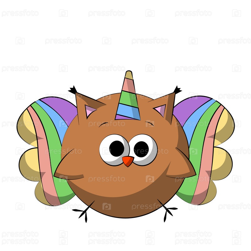 Милая сова в костюме радужного единорога с цветным крылом