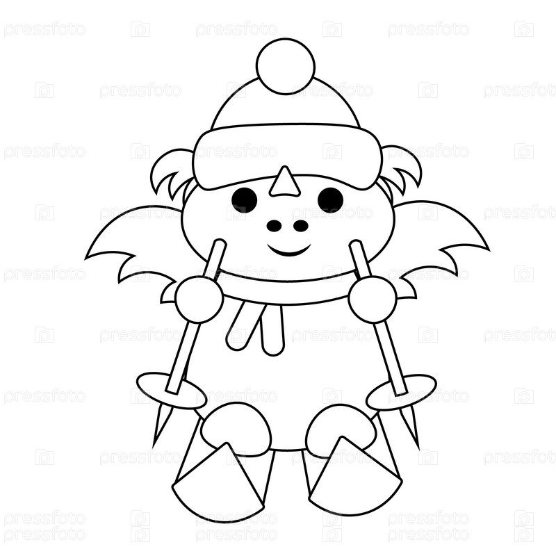 Милый мультяшный дракон на лыжах в черно-белом цвете