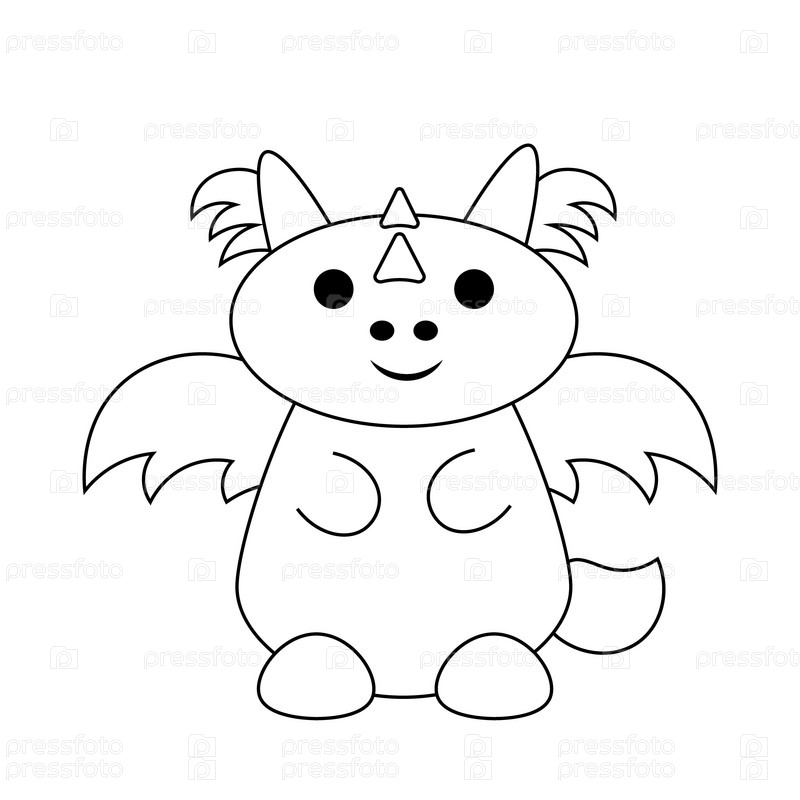 Милый мультяшный дракон с крыльями в черно-белом цвете