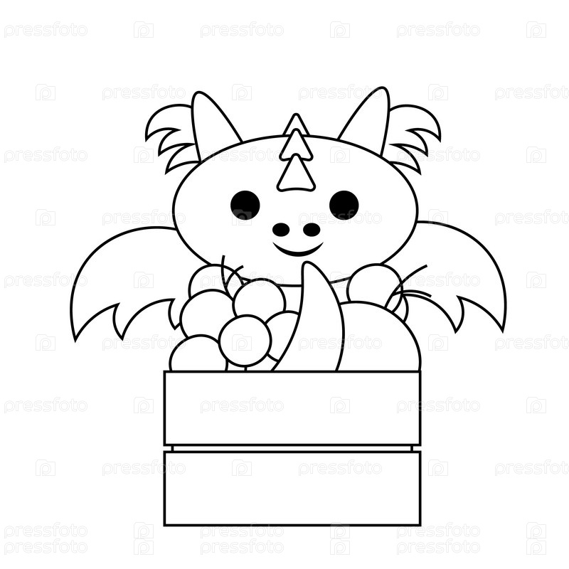 Милый мультяшный дракон с фруктами в деревянной коробке в черно-белом цвете