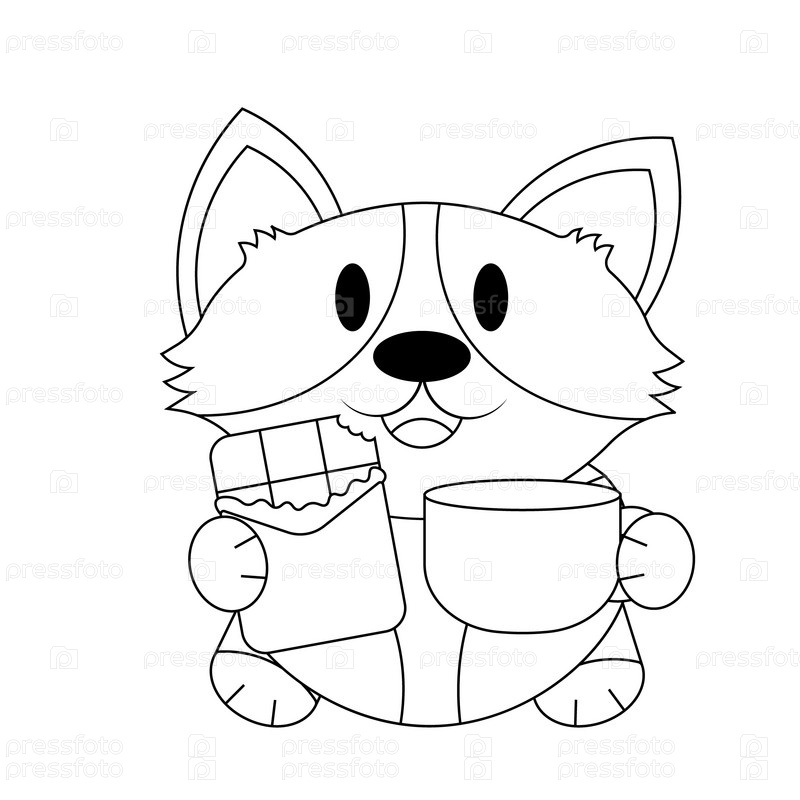 Милый корги с шоколадной плиткой и чашкой в черно-белом цвете