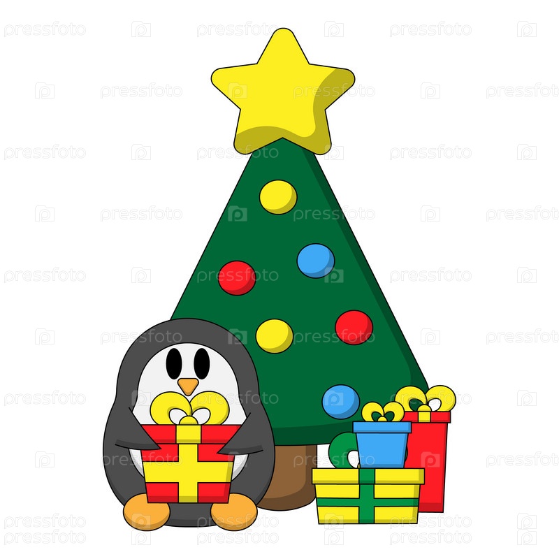 Милый мультяшный пингвин с елкой и цветной подарочной коробкой