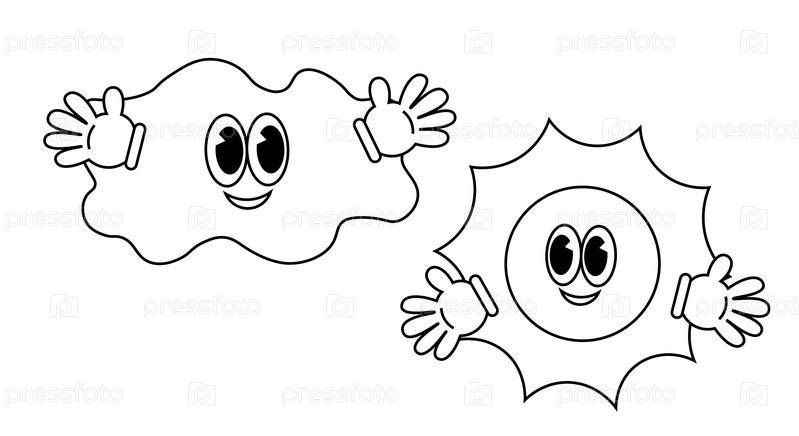 Солнце и облака. персонаж в мультипликационном стиле Groovy в черно-белом цвете