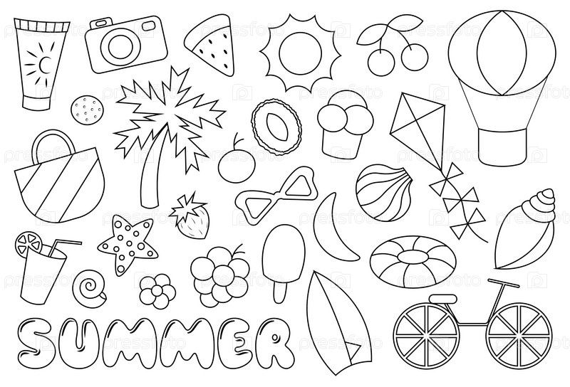 Мультяшный набор летних элементов в черно-белом цвете