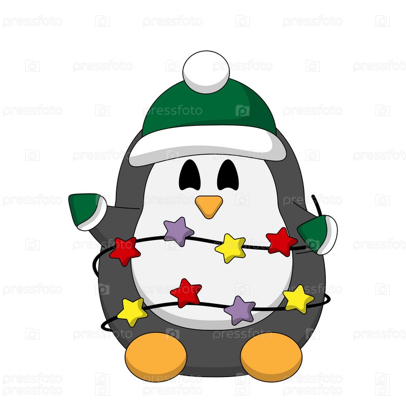 Милый мультяшный рождественский пингвин со звездной гирляндой в цвете