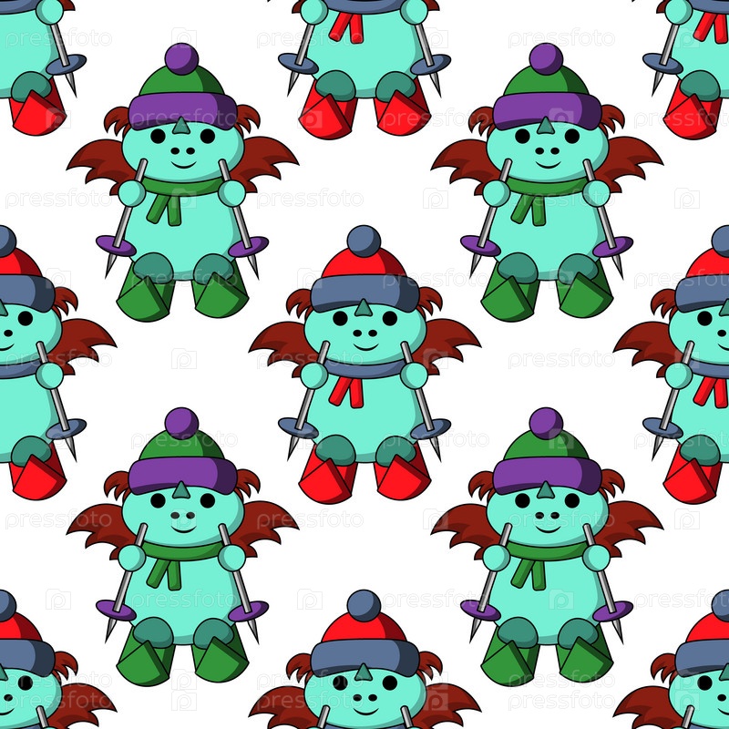 Бесшовный рисунок с милым драконом на лыжах