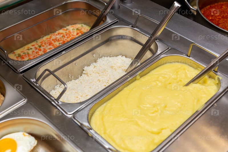 Бистро быстрого питания, еда в металлических подносах, гарнир из котлет-салатов на витрине кафе, кусочки с едой на прилавке бистро, мясо и гарнир в лоскутках