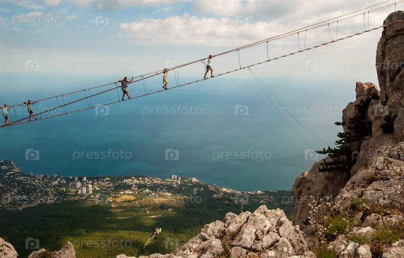 Пропасть между скалами туристы переходят по веревочным мостикам. Гора Ай-Петри, Крым
